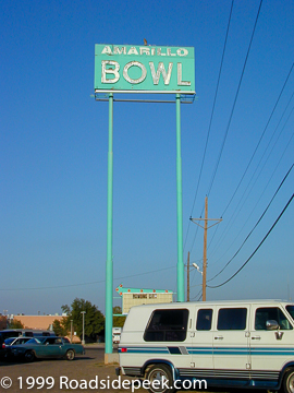 Check out this tall sign at the Amarillo Bowl. The Amarillo Bowl used to be located at 712 E. Amarillo Blvd which is Route 66. The bowling alley closed down several years ago and the property is now home to Lupita's Mexican Food. 08-21