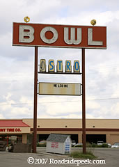The Astro Bowl in San Antonio, TX features an old time looking ten pin alley marquee. With a name that dates back to the 50's or 60's, hopefully this bowling will last longer than others with the same name. 07-07