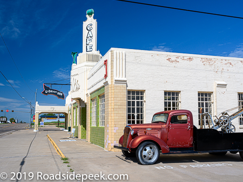 The diner itself recently reopened after having been closed for more than 25 years. Last seen serving food in 1995, the U-Drop Inn Cafe is run by long-time resident Osbaldo De Leon and serves sandwiches, ice cream and pie amongst other yummy items. If you happen to be traveling through Shamrock, it is worth a stop to pull off the Interstate and roll into the Tower Gas Station and U-Drop Inn Cafe. Especially to grab a bite and some ice cream and give some business to a Route 66 landmark. 09-21
