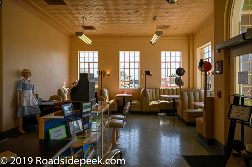The gas station section features Conoco branding which reflects the gas branding from decades back. Pumps are still located on site though they may no longer work. The cafe features an eating area that is also home to a store and gift shop. The name U-Drop Inn came from a naming contest where a local schoolboy submitted this creative that has stuck for decades.