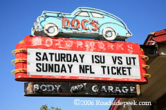 Here's a shot of eye-catching sign at Doc's Motorworks Bar and Grill. This Austin, TX location is usually open til' midnight and has quite a turnout. The sign was designed and built by Todd Sander's from Roadside Relics.