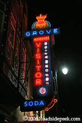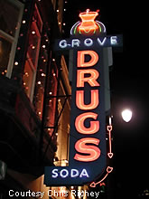 UPDATE 11/20 : The Grove Drugs sign was updaed and is now the sign for the Grove Visitor center. The Grove drugstore name dates back to 1933, however the business at 209 E Sixth Street was as a Morley Bros. and dates back to 1871. The sign was restored about 20 years ago.