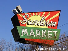 Here's an old roadside sign for Stinnett's Food Market pointing