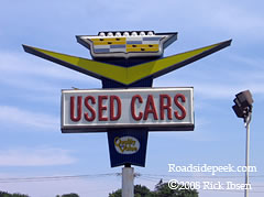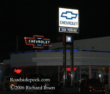 Check out the signage for the Perkin's Chevrolet in Milford,CT. This has been a Chevrolet dealer since the 1920s and the neon sign appears to be from that era. The sign didn't work and was in generally poor condition until it was taken down a couple years ago. I thought it was probably gone forever. About a year later it was put back up, restored and working and impressive. 02-06