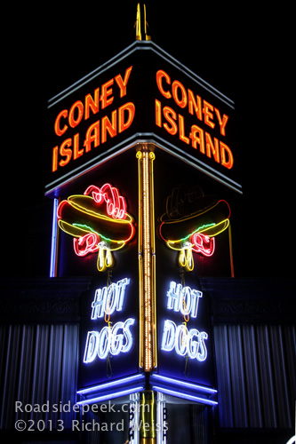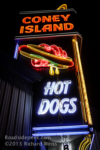 I saw this Coney Island sign and figured when done photographing I would pop into this place. This sign for the Coney Island Hot Dogs is quite large, somewhere around two stories of neon bliss making it one of the most fantastic vintage signs I ever saw. The drips of mustard are animated. 01-13 ~ Richard Weiss