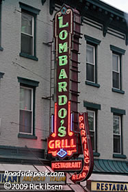 The rather prominent blade neon sign hangs off this restaurant in Albany. Lombardo's Grill has been in operation since 1919. When prohibition was repealed in 1934, an Italian consulate office and ice cream parlor was acquired and converted to the current barroom. Check out the Lombardo's website for more information. 10-09