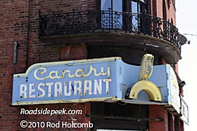 This faded out sign for the Canary Restaurant is found in Toronto, Canada. Looks like the sign itself may once have had neon tubing around the letters. 10-10