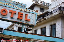 UPDATE 08/07 : The Moon Motel marquee is still there. The night time illumination is not what it could be as the owner has spent quite a sum to keep it lit without much success. Only the MOON MOTEL part lights up presently. Anyway, not a place for the squeamish. By my standards/expectations, I give it a D PLUS. Many would flunk it, but the sheets/towels were clean, there were no roaches and my girlfriend did not bolt. Actually, a real good cleaning/paint job/carpet and a repaired pool would easily improve the place. Many thanks to Christopher Hammersla for update. 08-07