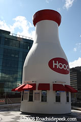 Here is a shot of the Hood Milk Bottle, located just off of the Fort Point Channel at Boston's Museum Wharf. The milk bottle is found next to the Boston Children's Museum. The bottle stands 40 feet tall and is used as an ice cream stand. Hood Dairy built the bottle out of wood in 1930, and it has been at this location since 1977. 02-08