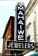 A beautiful jewelry shop sign sits outside the Mahaiwe Jewelers.
