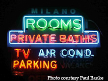 Here's a shot of the neon sign at the Milano Motel in Wildwood, NJ. Yes, the rooms have private baths. What's scary is