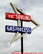 Traveling down the main 66 road in Litchfield, you can't help but see the Vic Suhling Gas for Less marquee. This standout sign clearly overshadows the building itself. Not sure if a gas station is actually there.
