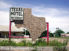 Always interesting are roadside signs in the shape of the state they represent. Here's the appropriately named Texas Motel, found off of the Mother Road in McLean, TX. 08-06